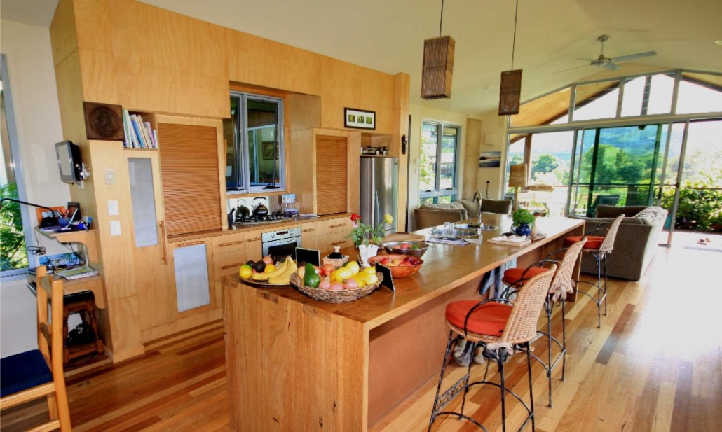 You will see that I often use a palette of natural materials:  Rammed earth, plywood linings, stained hardwoods, ventilation shutters.  I have found from experience that these materials are easier to live with for longer periods without the need for expensive renovations or re-painting a couple of years down the track.  It’s great to avoid the use of standard plasterboard finishes as well when possible.