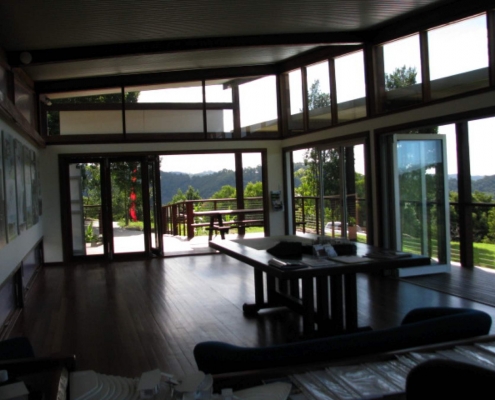 A simple structure of recycled post and rail system bolted to a recycled steel sub-floor structure sitting on top of massive concrete ballast blocks perched on top of one another as footings. Bi-fold doors and louvre windows open the plan right up to ocean views as far as Surfers Paradise. A plain back wall for architects display purposes doesn’t block the ventilation or light due to low level awning windows and high level polycarbonate sheeting. 2 roofs of Ritek sandwich panel give a striking yet simple effect reflecting the mountain appeal of the site.