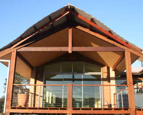 The owners wanted a sustainable design with open plan living, oh and gables to the front of their home. Not being happy with just a standard gable, I designed cantilevered curved roof iron to the gable ends adding an organic modern unique style. Supported by chunky recycled hwd posts and beams and touches of copper for durability. This is the first eco house I designed in The Ecovillage for clients that turned out to be neighbours and good friends. Before long I had designed over 30 sustainable homes here and more to follow…