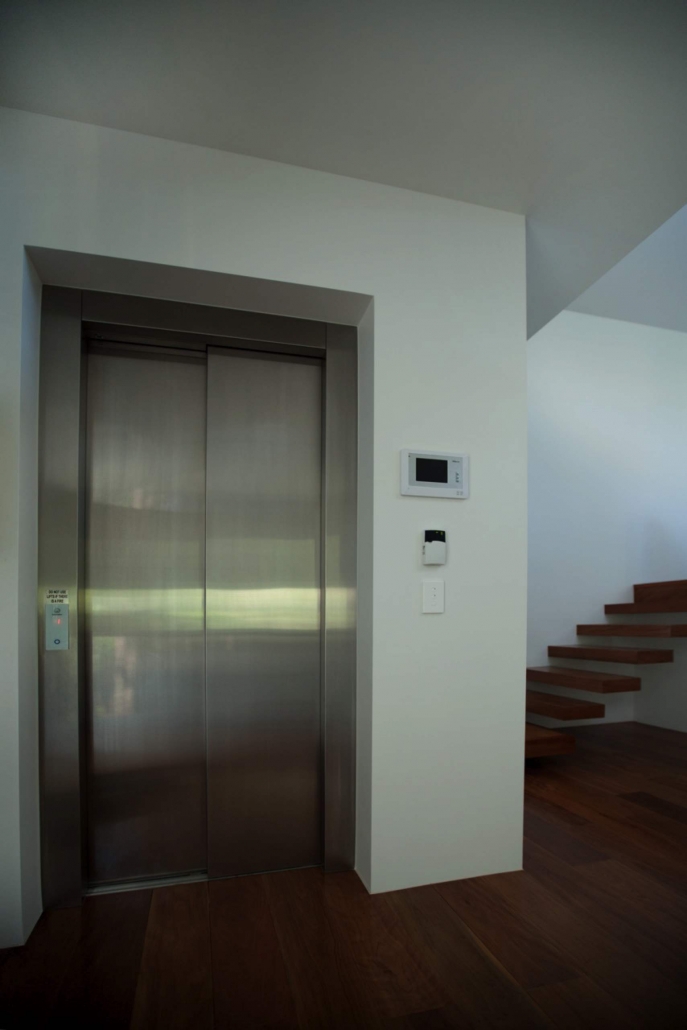 Due to council constraints and by necessity the house needed to step back up the hillside on many levels. One drives up a steep exposed concrete driveway to a double garage and double entry lift that transports people to the next level up. Stepping out onto a double height outdoor entertaining area you then travel via a stair and hallway lined with custom made hardwood chamfer board that offsets the poured insitu concrete finish. A fully self contained guest suite and patio is on the right and a gym/office is on the left. Another lift transports the occupants to the main living areas or up another level to the main bedroom and guest bedroom.